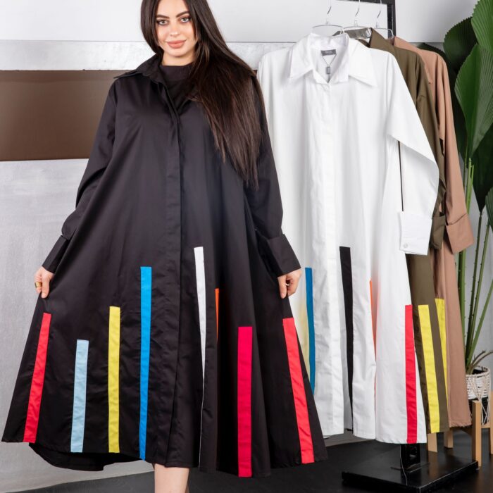 – **الزخرفة**: يُزين الجزء السفلي من الجاكيت بخطوط عمودية ملونة متعددة الألوان (أصفر، أزرق، أحمر، برتقالي، وأبيض).