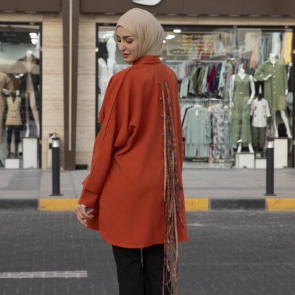 جاكيت نسائي طويل مع بروش على الصدر